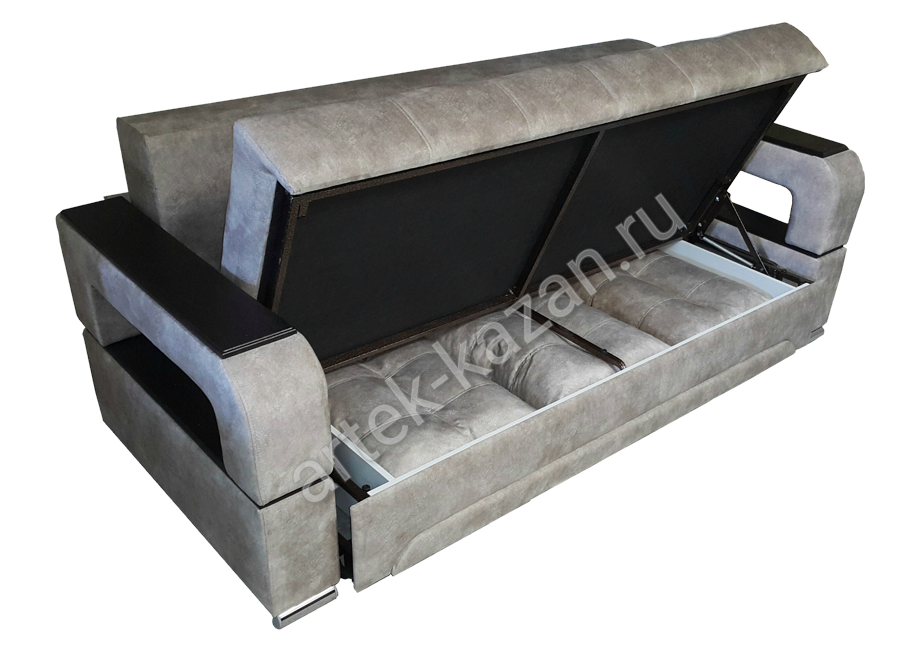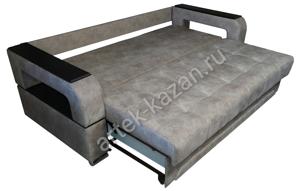 Диван в сложенном состоянии Диван в разложенном состоянии Бельевой ящик диванаДиван на металлическом каркасе с выкатным механизмом еврокнижка, который изготавливается на заводе в г. Ульяновск. На каркас прикручивается фанера 9мм., на фанеру сверху приклеивается ППУ или пружинный блок. Благодаря фанере в 9мм. на каркасе, диван не боится точечную нагрузку, то есть на диван, например, можно вставать ногами без риска поломки, но, конечно, при умеренной нагрузке. Механизм раскладки простой - выкатываете сидушку вперед, она выкатывается по полу на колесиках, далее спинку опускаете. Вместе с сидушкой выкатывается ящик для белья, что очень удобно, так как ящик для белья находится всегда перед вами. Чтобы открыть ящик для белья, надо просто поднять сидушку к верху. Длину дивана можно увеличивать или уменьшать на заказ с шагом 10см. до определенного размера. Форму подлокотников можно менять почти на любой из каталога. Толщина подлокотников разная, поэтому общий габарит будет меняться. В некоторых подлокотниках, таких как С5 - Сидней 5, можно вносить изменения в размер. Форму нижней части дивана можно менять. Цена на диван зависит от выбранной ткани, присутствия декоративной отстрочки, плотности ППУ, размеров, формы подушек и их наполнения и т.д. Все нюансы по поводу внесений изменений и цены обговариватюся при оформлении заказа. Если возникли какие-нибудь вопросы по дивану, то с удовольствием на них отвечу.