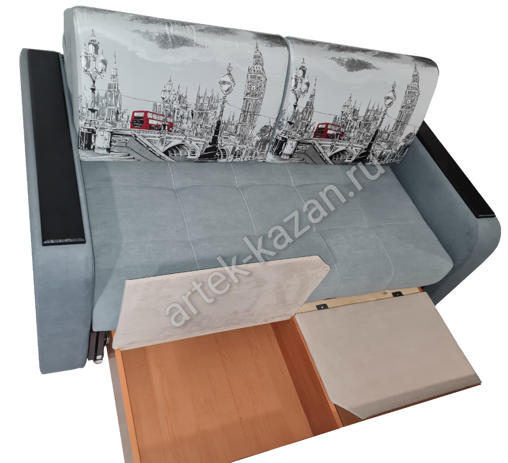 Диван в сложенном состоянии Диван в разложенном состоянии Бельевой ящик диванаМини-диван на металлическом каркасе с механизмом тройной расклад, который изготавливается на заводе в г. Ульяновск. На каркас прикручивается каркас из деревянной конструкции. Ширину спального места можно увеличивать или уменьшать на заказ с шагом 10см. в пределах от 60см. до 200см. То есть при ширине 60см. диван получится как кресло-кровать. Форму подлокотников можно менять почти на любой из каталога. Подушки у дивана используются как матрац, то есть они кладутся сверху на ящик для белья в разложенном состоянии. Толщина подлокотников разная, поэтому общий габарит будет меняться. В некоторых подлокотниках, таких как С5 - Сидней 5, можно вносить изменения в размер. Форму нижней части дивана можно менять. Цена на диван зависит от выбранной ткани, присутствия декоративной отстрочки, плотности ППУ, размеров, формы подушек и их наполнения и т.д. Все нюансы по поводу внесений изменений и цены обговариватюся при оформлении заказа. Если возникли какие-нибудь вопросы по дивану, то с удовольствием на них отвечу.