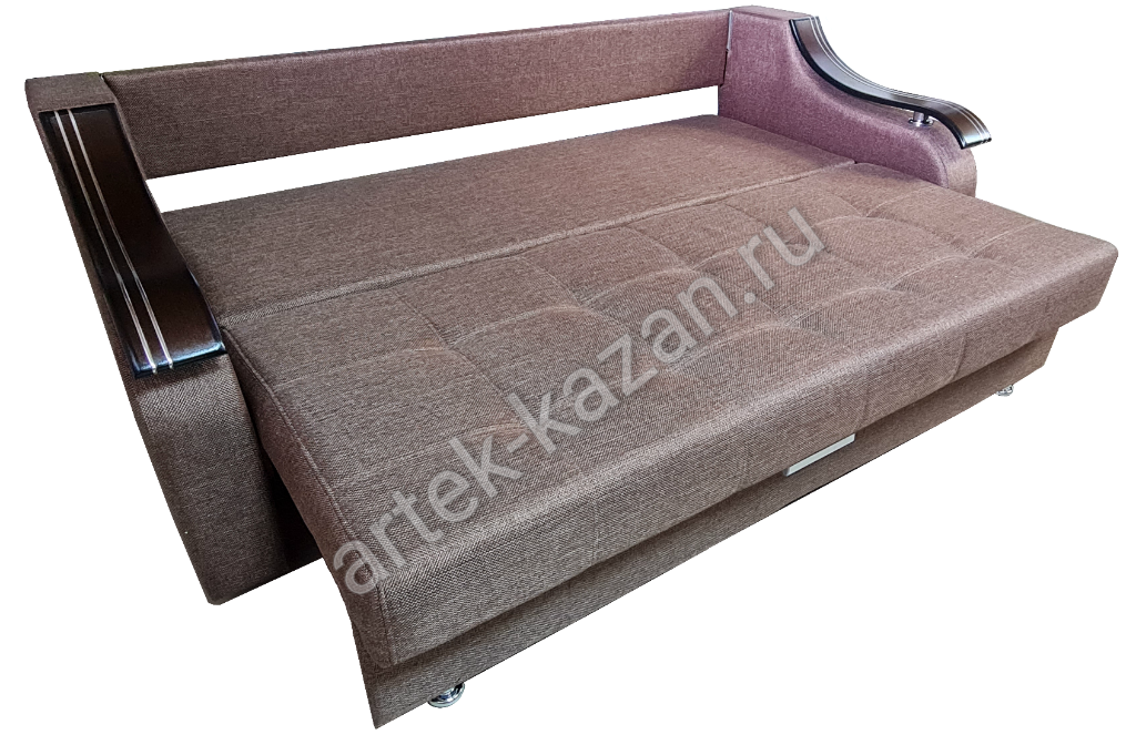 Диван в сложенном состоянии Диван в разложенном состоянии ВидеообзорДиван на металлическом каркасе с механизмом тик-так, который изготавливается на заводе в г. Ульяновск. Данный механизм завоевал популярность за счет простоты конструкции и долговечности механизма. Сидушка, при трансформации по круговой траектории, перемещается вперед или назад, не создавая, при этом, какое-либо воздействие на пол, что очень удобно, если на полу есть ковер и т.п. Спинка, при трансформации дивана в кровать, опускается вниз, занимая изначальное место сидушки. На каркас прикручивается фанера 9мм., на фанеру сверху приклеивается ППУ либо пружинный блок по желанию. Благодаря фанере в 9мм. на каркасе, диван не боится точечную нагрузку, то есть на диван, например, можно вставать ногами без риска поломки, но, конечно, при умеренной нагрузке. Длину дивана можно увеличивать или уменьшать на заказ с шагом 10см. до определенного размера. Форму подлокотников можно менять почти на любой из каталога. Толщина подлокотников разная, поэтому общий габарит будет меняться. В некоторых подлокотниках, таких как С5 - Сидней 5, можно вносить изменения в размер. Форму нижней части дивана и ножки можно менять. Цена на диван зависит от выбранной ткани, присутствия декоративной отстрочки, наполнителя, размеров, формы подушек и их наполнения и т.д. Все нюансы по поводу внесений изменений и цены обговариватюся при оформлении заказа. Если возникли какие-нибудь вопросы по дивану, то с удовольствием на них отвечу.