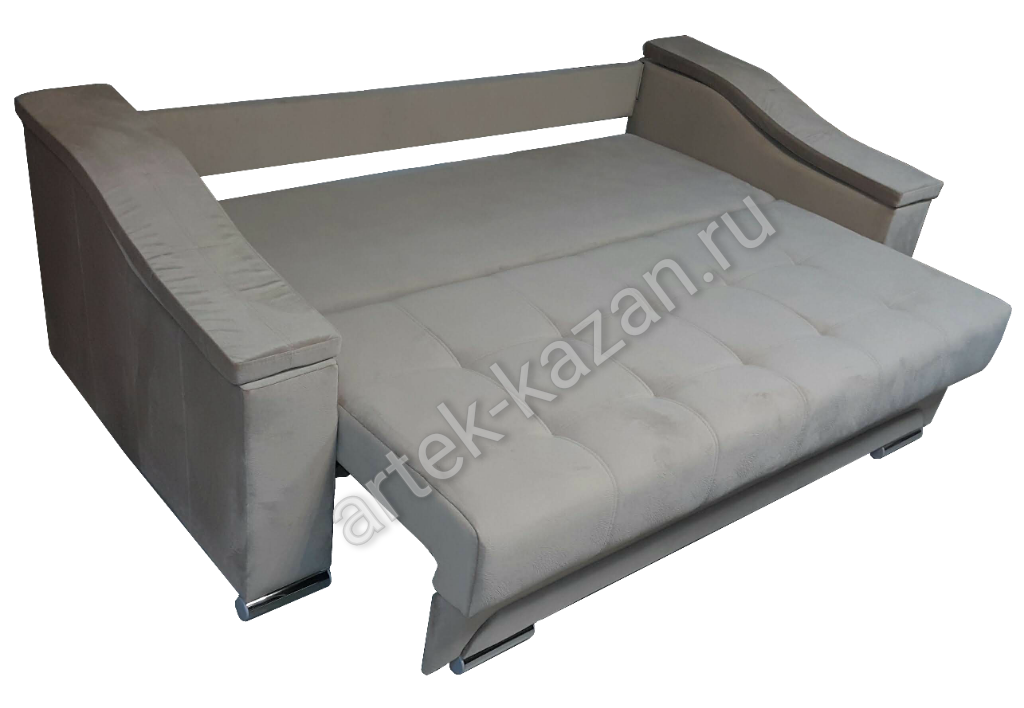 Диван в сложенном состоянии Диван в разложенном состоянии ВидеообзорДиван на металлическом каркасе с механизмом тик-так, который изготавливается на заводе в г. Ульяновск. Данный механизм завоевал популярность за счет простоты конструкции и долговечности механизма. Сидушка, при трансформации по круговой траектории, перемещается вперед или назад, не создавая, при этом, какое-либо воздействие на пол, что очень удобно, если на полу есть ковер и т.п. Спинка, при трансформации дивана в кровать, опускается вниз, занимая изначальное место сидушки. На каркас прикручивается фанера 9мм., на фанеру сверху приклеивается ППУ либо пружинный блок по желанию. Благодаря фанере в 9мм. на каркасе, диван не боится точечную нагрузку, то есть на диван, например, можно вставать ногами без риска поломки, но, конечно, при умеренной нагрузке. Длину дивана можно увеличивать или уменьшать на заказ с шагом 10см. до определенного размера. Форму подлокотников можно менять почти на любой из каталога. Толщина подлокотников разная, поэтому общий габарит будет меняться. В некоторых подлокотниках, таких как С5 - Сидней 5, можно вносить изменения в размер. Толщину подлокотника С9 - Сидней 9 можно менять. Стандартная толщина 22см., на фото подлокотники сделаны минус 7см., т.е. по 15см. Форму нижней части дивана и ножки можно менять. Цена на диван зависит от выбранной ткани, присутствия декоративной отстрочки, наполнителя, размеров, формы подушек и их наполнения и т.д. Все нюансы по поводу внесений изменений и цены обговариватюся при оформлении заказа. Если возникли какие-нибудь вопросы по дивану, то с удовольствием на них отвечу.