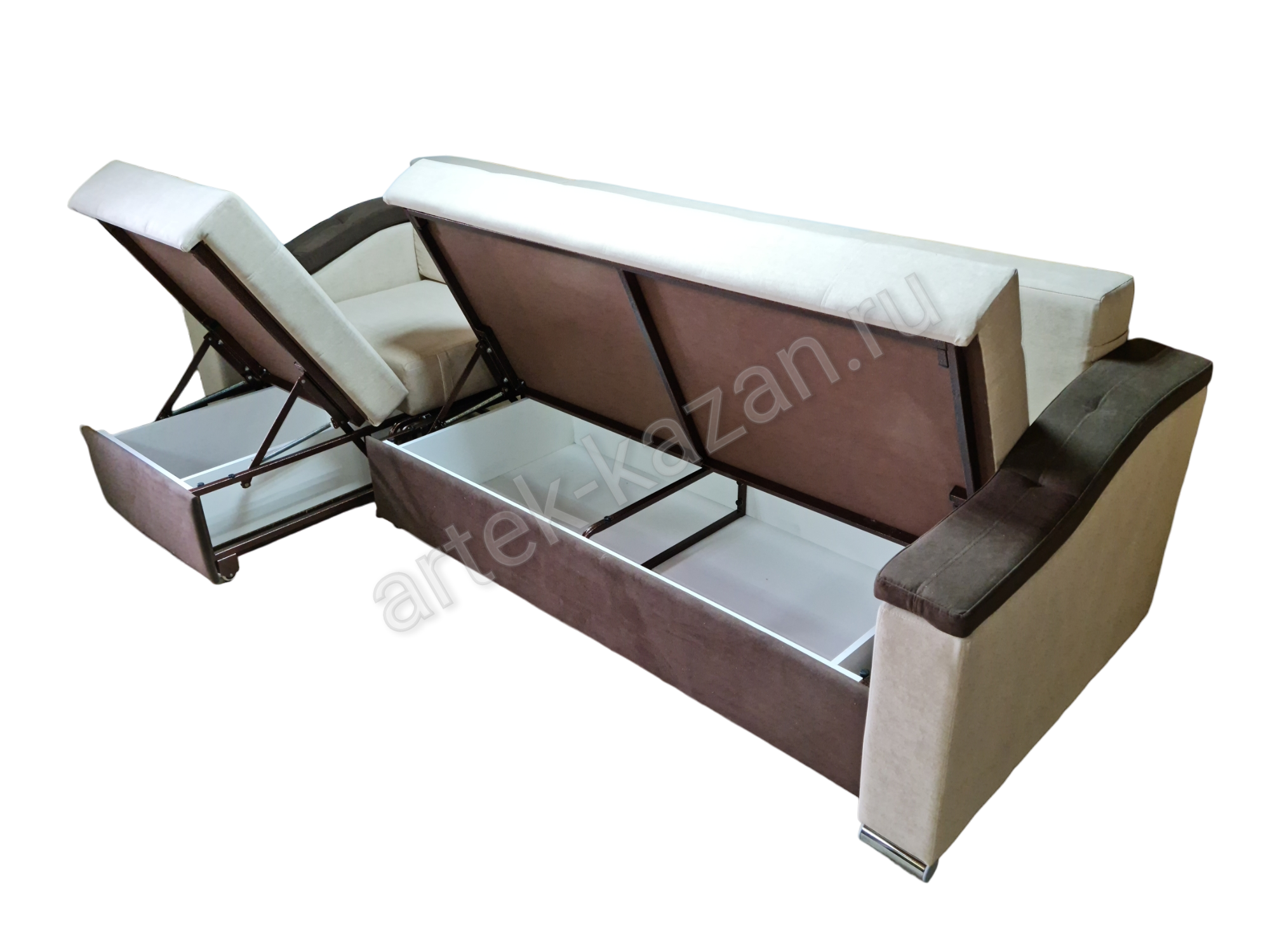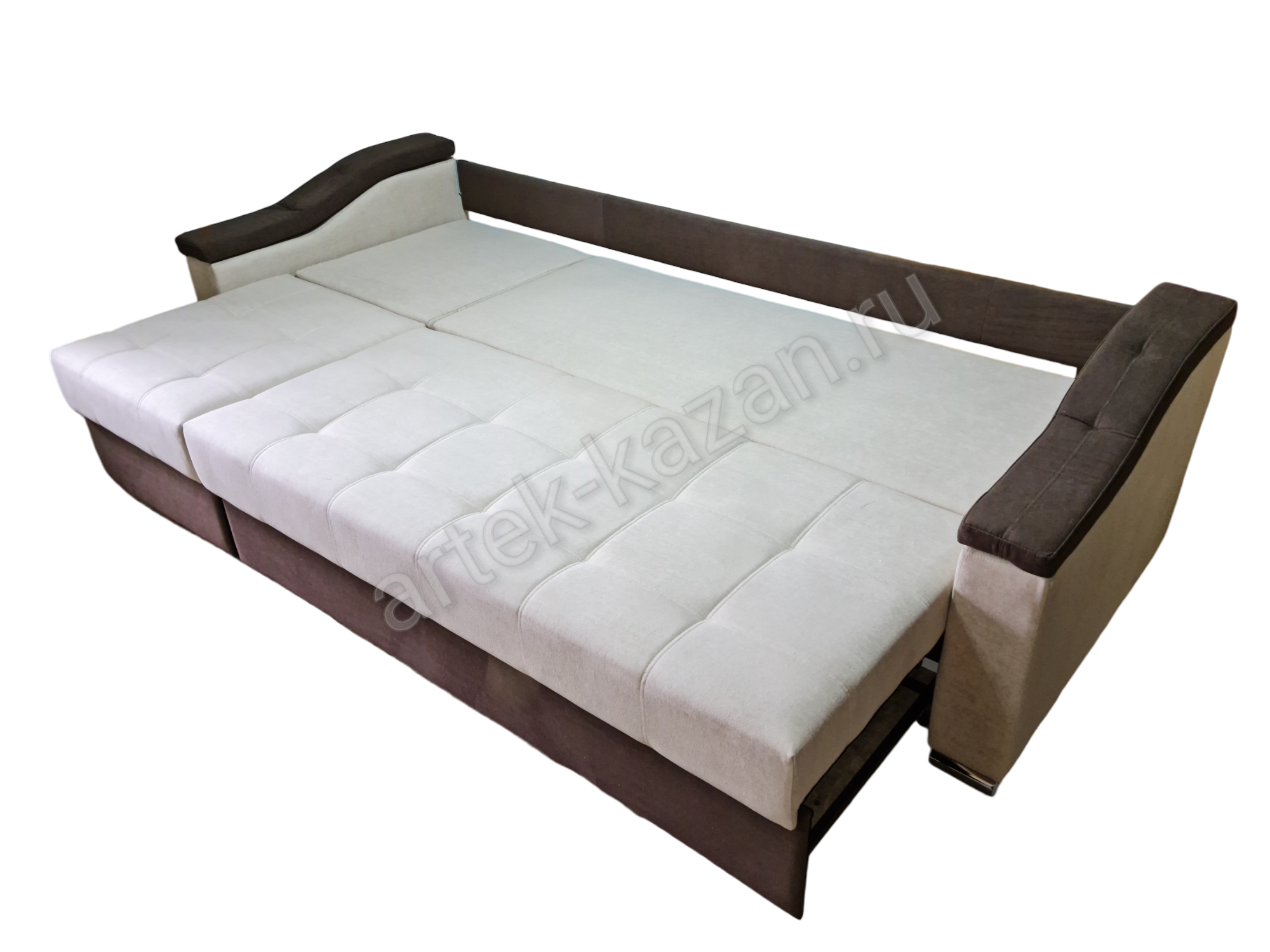 Диван в сложенном состоянии Диван в разложенном состоянии Вид сзадиБельевой ящик диванаДиван на металлическом каркасе с выкатным механизмом еврокнижка, который изготавливается на заводе в г. Ульяновск. На каркас прикручивается фанера 9мм., на фанеру сверху приклеивается ППУ или пружинный блок. Благодаря фанере в 9мм. на каркасе, диван не боится точечную нагрузку, то есть на диван, например, можно вставать ногами без риска поломки, но, конечно, при умеренной нагрузке. Механизм раскладки простой - выкатываете сидушку вперед, она выкатывается по полу на колесиках, далее спинку опускаете. Вместе с сидушкой выкатывается ящик для белья, что очень удобно, так как ящик для белья находится всегда перед вами. Чтобы открыть ящик для белья, надо просто поднять сидушку к верху. Два одинаковых механизма разного размера соединяются вместе, образуя таким образом трансформер. Длину дивана можно увеличивать или уменьшать на заказ с шагом 10см. до определенного размера. Форму подлокотников можно менять почти на любой из каталога. Толщина подлокотников разная, поэтому общий габарит будет меняться. В некоторых подлокотниках, таких как С5 - Сидней 5, можно вносить изменения в размер. Форму нижней части дивана можно менять. Цена на диван зависит от выбранной ткани, присутствия декоративной отстрочки, плотности ППУ, размеров, формы подушек и их наполнения и т.д. Все нюансы по поводу внесений изменений и цены обговариватюся при оформлении заказа. Если возникли какие-нибудь вопросы по дивану, то с удовольствием на них отвечу.