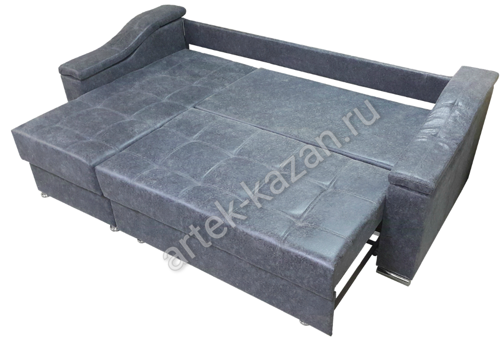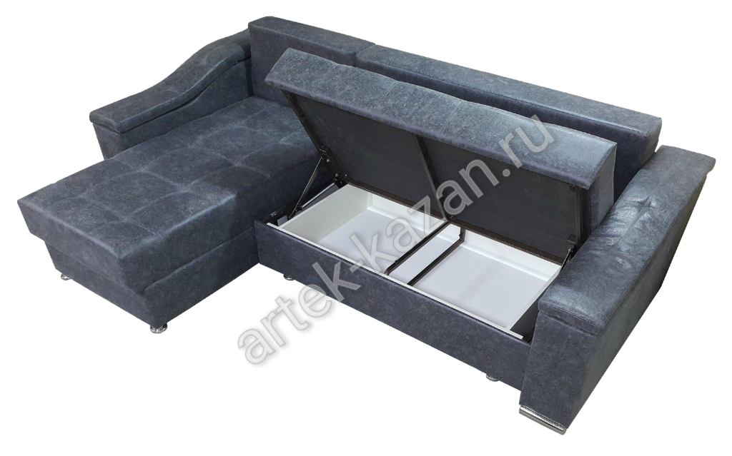 Диван в сложенном состоянии Диван в разложенном состоянии Бельевой ящик диванаУгловой диван на металлическом каркасе с выкатным механизмом еврокнижка, который изготавливается на заводе в г. Ульяновск. На каркас прикручивается фанера 9мм., на фанеру сверху приклеивается ППУ или пружинный блок. Благодаря фанере в 9мм. на каркасе, диван не боится точечную нагрузку, то есть на диван, например, можно вставать ногами без риска поломки, но, конечно, при умеренной нагрузке. Механизм раскладки простой - выкатываете сидушку вперед, она выкатывается по полу на колесиках, далее спинку опускаете. Вместе с сидушкой выкатывается ящик для белья, что очень удобно, так как ящик для белья находится всегда перед вами. Чтобы открыть ящик для белья, надо просто поднять сидушку к верху. Длину дивана можно увеличивать или уменьшать на заказ с шагом 10см. до определенного размера. Форму подлокотников можно менять почти на любой из каталога. Толщина подлокотников разная, поэтому общий габарит будет меняться. В некоторых подлокотниках, таких как С5 - Сидней 5, можно вносить изменения в размер. Ящик для белья есть только в обоих частях дивана. Сторону угла можно менять, в некоторых случаях сторону угла изменить нельзя. Форму нижней части дивана можно менять. Диван можно сделать П-образным. Цена на диван зависит от выбранной ткани, присутствия декоративной отстрочки, плотности ППУ, размеров, формы подушек и их наполнения и т.д. Все нюансы по поводу внесений изменений и цены обговариватюся при оформлении заказа. Если возникли какие-нибудь вопросы по дивану, то с удовольствием на них отвечу.